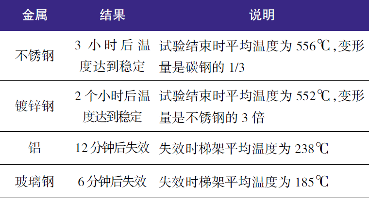 不锈钢:梯架温度达到稳定用了3 个小时,不锈钢梯架在3个小时里保持了其结构完整性。试验结束时梯架平均温度为556℃,单个梯架最高温度为565℃。不锈钢梯架3 个小时后的弯曲变形量仅为镀锌钢梯架2 个小时后变形量的1/3多一点。