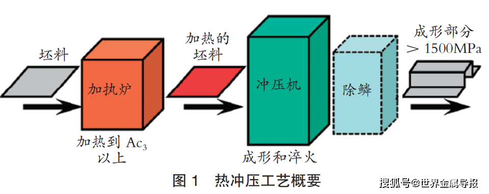 作为兼顾高强度特性和形状冻结性的方法,热冲压技术自2000年前后一直是汽车轻量化的方法之一,且其应用范围持续扩大,图1是热冲压技术的概要。通常,通过淬火提高钢板强度,钢板在加热炉加热为奥氏体域的温度(Ac3以上)后,送往冲压机,进行冲压成形。在淬火开始前完成成形,并通过模具的散热急冷,进行淬火。目前普及的是1500MPa级的材料。更高强度的1800MPa级材料也正在用于实际构件。今后,与高强度钢板冷成形技术相比,在热冲压中有可能进一步高强度化。