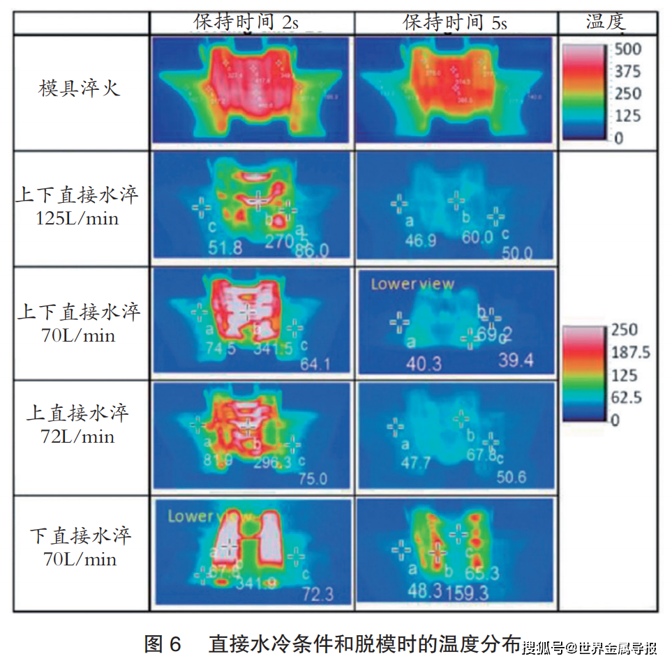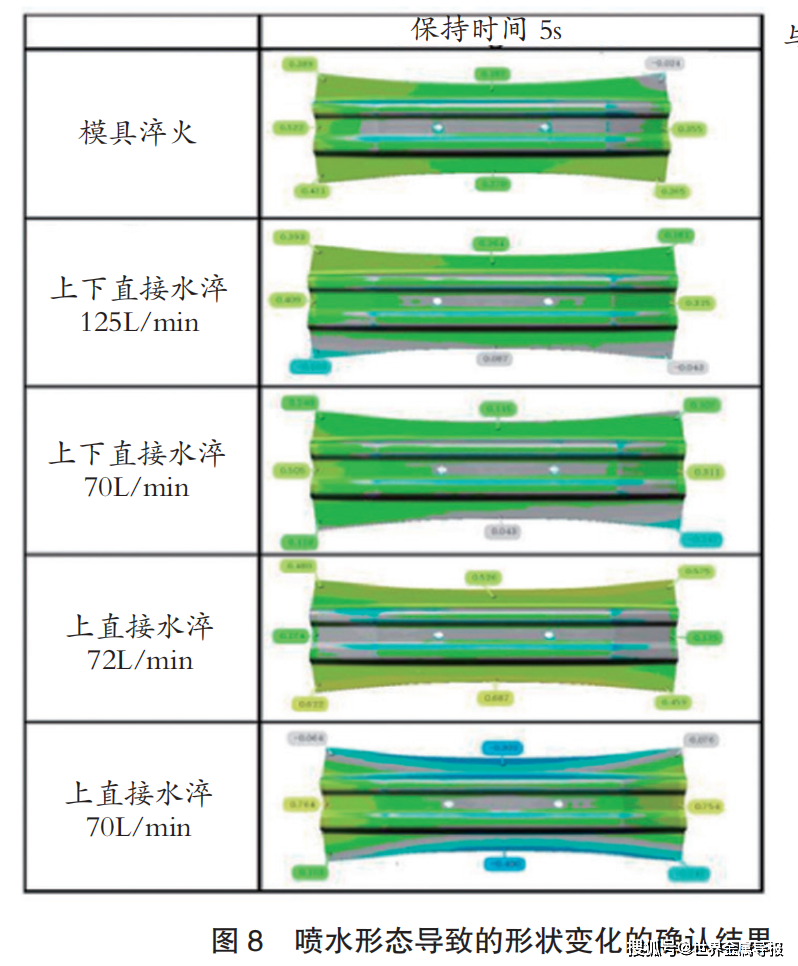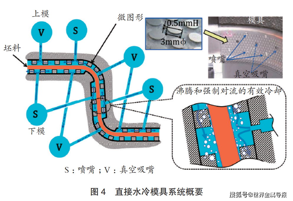 然而,汽车部件的性能不仅取决于材料强度,而且还根据所需要的性能,追求构件结构的高性能化技术也在不断发展。典型的例子是冷成形用料的拼焊技术。它可以由异钢种、异厚度材拼焊,使成形部件具有高性能。热冲压工艺流程包括加热和冷却,所以提出了运用热处理的灵活性,通过不同热处理条件控制,制作不同部位、强度不同部件的技术。形成了包括使用异钢种、异厚度拼焊材料的“组合性能”综合制造技术。 另一方面,由于其包括热过程,因此,加热、运送和冷却各个环节都有时间约束,与冷冲压相比,存在生产率低的问题。常规上,一般是采取缩短冲压工序冷却时间的对策,组合性能法也有冷却速度慢的部位,存在生产率低的问题。此外,认为还必须应对冲压后的温度分布和特性差的影响以及确保构件形状精度等问题。 高性能化的试验(组合性能) 1.1 试验方法 在热冲压构件高性能化的各种组合性能法中,对仅使用热处理的部分加热模具的强度差施工法,进行了效果验证试验。试验装置由压力机、加热模具(上冲头)和加热器控制单元构成。试验模具使用宽80mm、高60mm、长700mm的帽形构件成形用模具。在上侧冲头的断面内,装入了筒形加热器和热电偶,在冲头纵向分割成三块,每块之间采用隔热措施,每块可以单独部分加热。加热器控制配线等通过模具背面连接控制单元。此外,作为热冲压用的模具材料使用常用的SKD61。 试验用料使用了板厚1.6mm的1500MPa级热冲压用镀锌钢板。坯料尺寸宽226mm×长700mm,成形后的凸缘宽15mm。 部分加热的温度条件是,将中央块的模具温度加热到280℃并保持30s,旨在增加淬火时的残余奥氏体,以创建一个软化部分。此外,为了比较构件形状和硬度,还实施了无模具加热并保持15s的常规热冲压施工法。试验中的模具温度用配置在模具内的热电偶测定,模具表面和成形品的温度状态由压力机侧面的热成像仪测定。 1.2 试验结果 在加热炉将坯料加热到950℃,运送到冲压机,在约700℃冲压成形,在部分加热模具内保持,脱模后成形品的温度分布状况示于图2。加热模具部的垂直壁部位约为200-250℃,不加热模具部分为明显不同的温度状态。 垂直壁中央部的纵向硬度分布显示,在不加热的模具条件下,1500MPa级材料热冲压后,通常获得均匀的硬度,约为450HV。而在中央部用加热的模具保持时,中央部的硬度下降到约350HV,清楚地看到了高温保持的特性差。距边界不加热部位一侧约50mm是加热部和不加热部边界的硬度过渡区域。 测定了成形部件的形状,比较与设计形状的差异,其结果示于图3。上段(a)是无模具加热保持15s模具淬火部件;下段(b)是部分加热模具保持30s部件的结果,示出了各个平面(顶板、凸缘面)与侧面(垂直壁面)。无模具加热时,误差范围在0-0.5mm,加热模具时,垂直壁中央呈膨胀状态,特别是膨胀大的壁下部,误差为3mm。此外,顶板和凸缘两端部分为下垂的状态。在这种部分温度履历不同的施工法中,为了保证部件形状精度,需要构筑温度分布、冷却经历引起的形状变化的预测技术、构件断面结构和模具结构的设计技术。 直接水冷模具的评价 2.1 直接水冷模具冷却系统 作为热冲压方法特征的模具中的淬火,依赖高温成形品表面与内部水冷模具表面之间的接触热传递。但是,像汽车部件那样复杂形状面上形成的构件中,由于构件内产生的板厚分布、模具制作精度等的影响,模具与成形品表面的接触有接触良好的部位,也有在模具与成形品之间产生间隙,接触不良或接触不到的部位。在间隙部位由于空气层的隔热,与接触良好部位相比,冷却速度降低,淬火时间成为瓶颈。因此,作为不仅采用接触传热而且采用流体制冷剂传热形式的冷却方法,设计了从模具直接喷冷却水,冷却成形品的直接水冷施工法。 图4是该施工法的模具结构。图中示出了用上下模具夹在中间的高温坯料的状态。最大的特征是在连接成形品的模具表面设有称为微图形(MP)的凹凸形状,即使是模具关闭状态也可以保证制冷剂的流动路径。还适当配置了将冷却水从模具内部引入MP加工面的喷水孔,将高温成形品与冷却水界面发生的蒸汽以及剩余冷却水从MP加工面排出的吸水孔,构成成形品表面整体基本覆盖的冷却流路网。 板厚为1.4mm钢板,用常规模具冷却到淬火结束(200℃以下)需要约10s,而采用上述冷却系统冷却到常温(水温附近)只需要2.5s。利用该特征的高生产率热冲压施工法可以量产部件。但是,因为存在模具面形状导致MP加工范围的限制,有模具结构导致的喷水孔和吸水孔的加工位置受限,虽然可以快速冷却,但不能稳定获得均匀的温度履历和温度分布。这有时也会影响形状精度,为使温度分布均匀,需要使冷却能力与低冷速侧相匹配。 在此,为了研究调整冷却速度复杂的异厚度、异强度部件适当的冷却设计条件,以短时间冷却难度高的厚材为对象,制备直接水冷模具,再次确认了冷却特性和形状控制的方向。 2.2 试验方法 图5是构件模拟模具的形状。不对称的M形横截面、高度和宽度渐变部结合,是保险杠和立柱的横截面形状要素。冷却面的MP加工用蚀刻加工成0.5mm深度凹槽,留下3mm直径的圆形接触面。另外,为了避免凸状的棱线部分滑动和咬合,不加工MP。喷水孔和吸水孔以30mm的间距配置在MP加工面上,喷水和吸水以错开半个间距的格子状配置。试验用料是板厚2.6mm的1500MPa级热冲压用镀