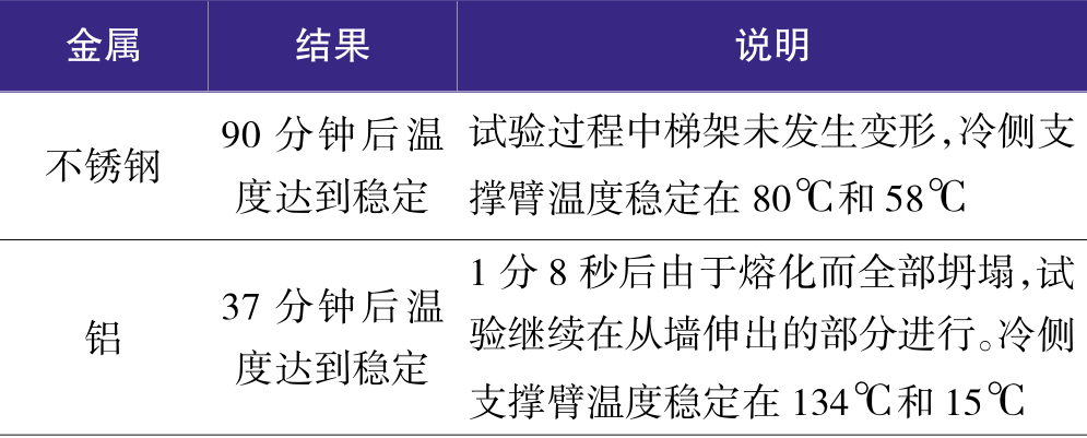 不锈钢:整个试验中不锈钢梯架保持不变,90 分钟后试验中止,此时墙冷侧的温度达到稳定,一个梯架臂的温度是 80℃,另一个是 58℃。