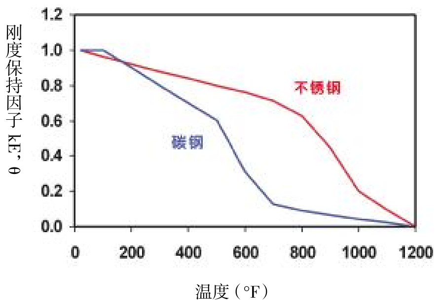 研究表明,在 800℃(1472°F)的高温下,不锈钢保持刚度的能力是碳钢的 7 倍。由于不锈钢在高温下具有良好的刚度保持能力,用于结构用途时可以不使用隔热保护材料。