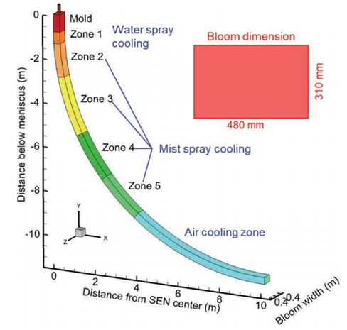 目前轴承钢的生产工艺路线是碱性氧气转炉(BOF)→钢包精炼炉(LF)→真空脱气(VD)→连铸CC→轧制。在转炉的出钢期间,添加铝合金到钢水包中沉淀脱氧,添加SiFe合金到渣面上进行扩散脱氧,以此来降低钢中的溶解氧到ppm的水平上来,最终在稳态连铸条件下的钢水中的全氧含量约为5 ppm。铸坯的断面几何尺寸为310 mm × 480 mm,拉速为0.51 m/min,中间包钢水温度为1 753 K,此钢种的液相线为1728 K,固相线为1602 K。连铸机冷却段有5个二冷控制区和一段空冷区,如图1所示。足辊区为水喷嘴冷却,由两段水路控制,其余四个区采用气水雾化喷嘴冷却,然后是空冷,各冷却区长度和水流量见表1。