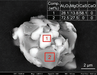 铸坯中的夹杂物大多近乎球形,图4为典型夹杂物的三维形态,该夹杂物是用无水溶液电解提取的,夹杂物直径约为8 μm,由两相交错组成,灰色为多面体状MgO·Al2O3尖晶石相,白色为光滑状CaS相。