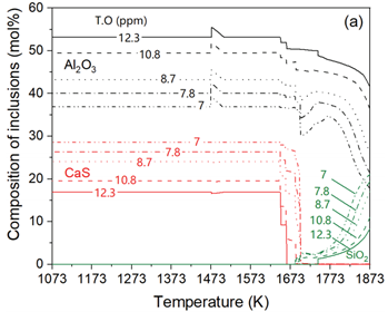 转变夹杂物相进入到简单的化合物,图9给出了夹杂物中Al2O3、MgO、CaO、SiO2和CaS的平衡含量,随着温度从1 873 K降低到1673 K,夹杂物中CaO和SiO2的平均含量显著降低,同时,Al2O3、MgO、CaS含量上升,夹杂物由CaO-Al2O3-SiO2-MgO变为CaS - Al2O3 - MgO。然而,随着全氧含量的降低,随着温度的降低,夹杂物中Al2O3含量显著降低,而MgO和CaS含量显著升高。在高温条件下,CaO含量随全氧增加而降低,在低温条件下,CaO含量随全氧增加而略有增加。SiO2仅在高温条件下稳定,在低温条件下几乎没有SiO2,这与工业实验结果一致。