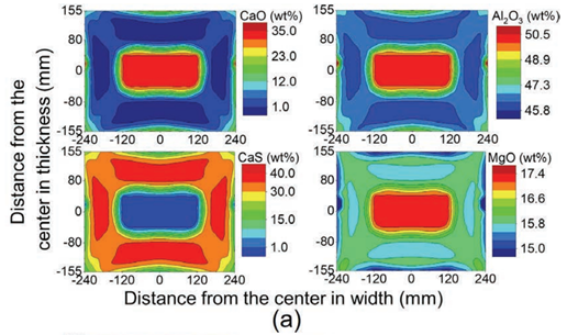 在轴承钢中间包浇铸的头坯中的夹杂物成分分布进行研究,综合模型耦合现场实际工艺参数、铸坯的传热过程,热力学,动力学建立了预测整个连铸坯完整截面的的夹杂物的成分分布,得出了以下结论。