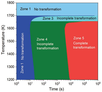 利用TTT图轮廓定量评价转变比例,如图15所示。当温度高于1700 K时,夹杂物的成分没有发生转变,这与热力学分析一致。当温度低于1700k时,相变率随反应时间的增加而增加,且较低温度下的相变明显滞后于较高温度下的相变。图15可以用来精确地控制在恒温加热和保温过程中铸坯中夹杂物的组成。例如,一旦给出了夹杂物中CaS的目标含量,就可以得到在一定温度下铸坯的保温时间。如果1%的转换比率被定义为转换的开始和完成一个转化率为97%,整个区域被划分为5个典型的子区域,称为“非转变区”,“不完全转变区”,和“完全转变区”,如图16所示。非转变的1区和不完全转变的3区受热力学约束,第2区和第4区主要受动力学约束。