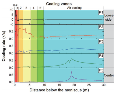 图21 计算冷却速度在5个位置与间隔距离从内弧一边到铸坯的中心