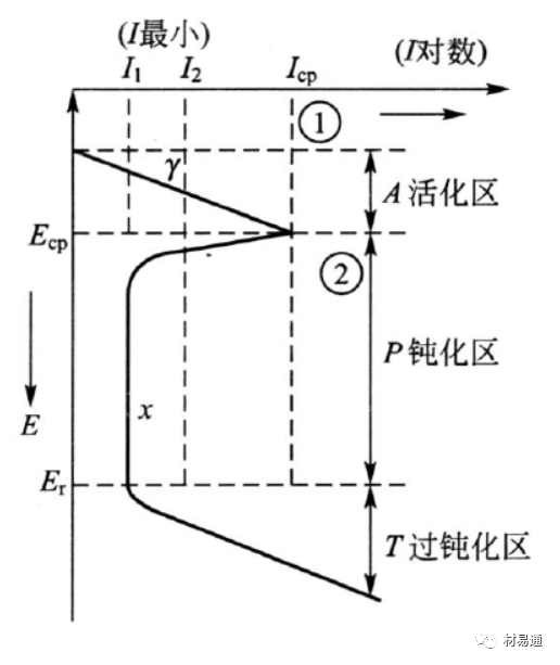 常用的Fe、Cr、Ni、Ti等金属的阳极极化过程具有独特的极化形式。阳极通路后,阳极电位升高,阳极电流(腐蚀速度)随之变化,几乎有着相同的规律,极化曲线的典型形式如下图所示。随着阳极极化电位的升高,腐蚀电流不是均匀的降低,而是先增加,然后减少到最小,并保持这个电流经一定的电位升高阶段,然后电流再增加。这类极化曲线称为具有活化、钝化转变的阳极极化曲线,并把这类曲线分为3个区域:活化区(A)、钝化区(B)、过钝化区(T)。