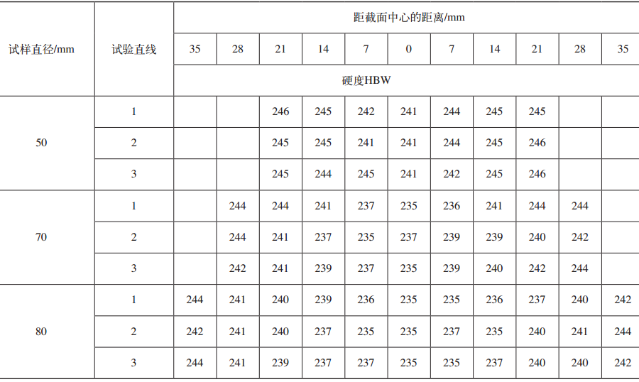 45钢的淬透性较差,自来水冷却时的临界淬火直径为10~15mm,盐水冷却时也不超过25mm。工件尺寸若超过临界淬火直径,则调质效果差,尺寸越大效果越差。因此,45钢的大截面工件调质处理,沿截面不会得到均匀的组织,达不到调质的效果。为了改善这一状况,一般采用提高加热温度或选用剧烈的冷却介质,前者会引起氧化脱碳,且能耗大,后者易引起变形开裂。因此,对于超过临界直径淬火的工件,往往采用正火作为最终处理,但正火除冷却速度较慢外,冷却速度还要受到环境、气温、温度的影响,使硬度无法控制,正火的质量难以保证。国内有人研究用沸水淬火代替调质的热处理工艺,获得了成功,现简介如下:试验用45钢的wC为0.46%,箱式炉加热,试样规格为φ50mm×150mm、φ70mm×210mm、φ80mm×210mm,加热温度为840℃,采用100℃沸水冷却,在其1/2长度横截面上,沿3条过中心且均匀分布的直线测其硬度,结果见表3。