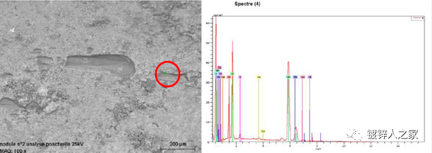 麻点主要出现在带钢的边部,平行于生产线的轧制方向排列,呈凹陷、圆滑的界面形貌,也有一定的方向性,在带钢的长度方向上呈彗星状,直径为20~30um 左右。可见这种麻点是由于异物硌伤造成的。