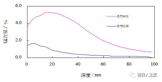 高强钢含有很高的Mn、Si、Al、Cr,在带钢温度达到800℃,保护气体成分为5%~8%H2,露点为-30℃的条件下,这些合金元素都处于氧化状态,而Fe处于还原状态,这就是选择性氧化。发生选择性氧化的结果就使得合金元素在带钢的表面发生聚集,如下图所示,某公司在生产两种不同的高强钢产品时,在带钢表面出现了非常明显的Mn的聚集,表面氧化物主要以这些合金元素为主,含Fe量很低。