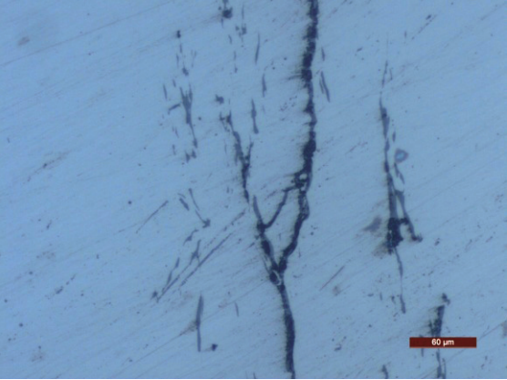 对盖板进行金相制样(未腐蚀),使用LEICA DM4000M显微镜观察盖板裂纹,金相如图3所示。