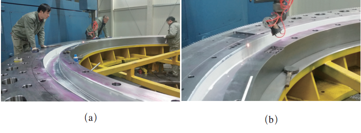设计专用的支撑胎具,将胎具放置在工作台上,并使得胎具承载齿圈。支撑胎具,即6m大型整体工装,主要用于增强齿圈本身的刚性,便于装夹和找正;找正齿圈基准在0.020mm以内,然后计算和调整机床输入参数,以便加工时齿圈的线速度满足激光淬火的要求,如图2所示。