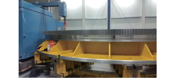 大型滚齿机内输入合适的参数,借助大型滚齿机的工作台旋转,胎具带动齿圈按照预定的线速度旋转。