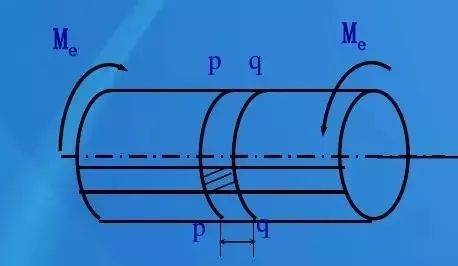 在轴表面作圆周线和纵向线,在扭转力偶矩作用下,圆周线长度形状不变,各圆周线间距离不变,只是绕轴线转了一个微小角度;纵向平行线仍然保持为直线且相互平行,只是倾斜了一个微小角度。变形如图所示。