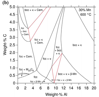 低密度Fe-Mn-Al-C钢的特征有单相(bcc-铁素体/fcc-奥氏体)或双相(铁素体+奥氏体)结构,这取决于合金含量和热机处理,具有复杂分布的碳化物。在低密度钢中,最为关心的碳化物是MC、M3C、M23C6和M7C3型碳化物,以及有序的fcc (L’12)(Fe, Mn)3AlC碳化物,即κ-碳化物。[16 – 19] 通常,计算Fe–Mn–Al–C钢种等温截面的相图强烈依靠热力学数据库,有不同的描述报道。相图显示了铝含量扩大了铁素体相范围,抑制奥氏体相范围的总体趋势。这些图还预测到,对于给定的Al含量,奥氏体区随着C和Mn含量的增加而增大。图2显示了由PrecHiMn-4数据库计算的1 000℃(a)和600℃(b)下奥氏体Fe-30Mn-Al-C钢的等温相截面。[19]这些图表明,奥氏体在低Al含量(<6 wt.%)时是稳定的。随着C含量的增加,高铝钢中的奥氏体稳定性也随之提高(例如,添加1 wt.% C可增加奥氏体相的稳定性,其铝含量直到9 ~ 10 wt.% Al)。这些图也表明在Fe–Mn–Al–C钢奥氏体中κ 相稳定性是需要高铝和高碳的。在600℃时,Al >5 wt.%, C >1 wt.%时形成κ-碳化物。低Al含量(Al <6 wt.%)时,可形成渗碳体和M23C6型碳化物,而不是κ型碳化物。有趣的是,这张图也揭示了奥氏体、铁素体、渗碳体和κ-碳化物在特定的Al和C含量范围内是稳定的。例如,在高C含量(>1 wt.%C)下,可以发生κ-碳化物和渗碳体组合形式,另一方面,在高Al含量(>9 wt.%Al)时,铁素体、奥氏体和κ-相在有限的C含量范围内稳定。这些特征表明,为了促进κ-碳化物在奥氏体中的析出,必须严格控制C含量和退火温度。可以看出,在1 000℃时,κ-碳化物只有在C和Al含量较大时才稳定,如C >1.5 wt.% - Al >12 wt.%和C > 3wt.% - Al > 6 wt.%,这与实际使用的成分范围不相关。