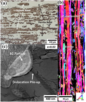 铁素体基双相钢含有中等Mn含量(3-10 wt.%), Al含量(5-9 wt.%)和低C含量(< 0.4 wt.%),[10,44,48]这些钢具有复杂的双模态的δ-铁素体和奥氏体沿着轧制方向的带状组织,见图6(a),奥氏体带的相结构强烈地依赖于Mn含量和退火处理条件。奥氏体部分或完全转变为沿母相γ晶界或在δ/γ界面处形成的(α + κ)片状领域,层状(α + κ)结构的特征是细长的棒状半共格的κ-碳化物。高Mn含量时,抑制了γ→α + κ的分解,出现了γ→α′的马氏体相变。[46,47]奥氏体机体为主的双相Fe-Mn-Al-C钢Mn和Al含量较高(Mn > 25 wt.%和Al > 9 wt.%),Al含量为5 ~ 12 wt.%, C含量为0.6 ~ 1.2 wt.%[3,8,8,11,12,32,43.,45,47,49,50] 在淬火态时均表现出充分的奥氏体组织。在500-800℃温度时效后,沿奥氏体晶界可形成复杂的铁素体带结构。另一方面,铁素体基双相钢具有复杂的δ-铁素体带状结构和沿轧制方向延伸的奥氏体条带,如图6(b)所示。从图中可以看出,奥氏体可以发生应变诱导的α′-马氏体转变。除了L ' 12 κ-碳化物的形成外,最近还提出了几种促进有序B2型析出相形成的析出策略。添加镍和铜约3 - 5 wt. %,使非剪切的 B2-type析出物在奥氏体带析出,导致增强机械性能。[8, 12,50]作为一个例子,图6 (c)显示在Fe-12Mn-7Al-0.5C-3Cu钢中,B2富铜析出物界面位错的聚集。根据合金含量和退火条件,铁素体条带可以含有B2析出物,κ-碳化物和奥氏体晶粒。κ-碳化物是通过共析分解γ→α + κ形成的。