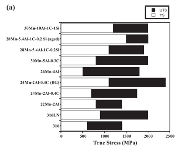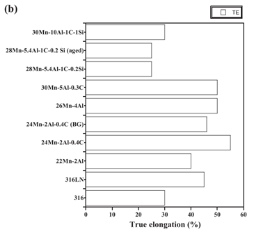 - 奥氏体钢表现出良好的拉伸性能组合,即UTS为600-1 100 MPa, TE为40-100%。