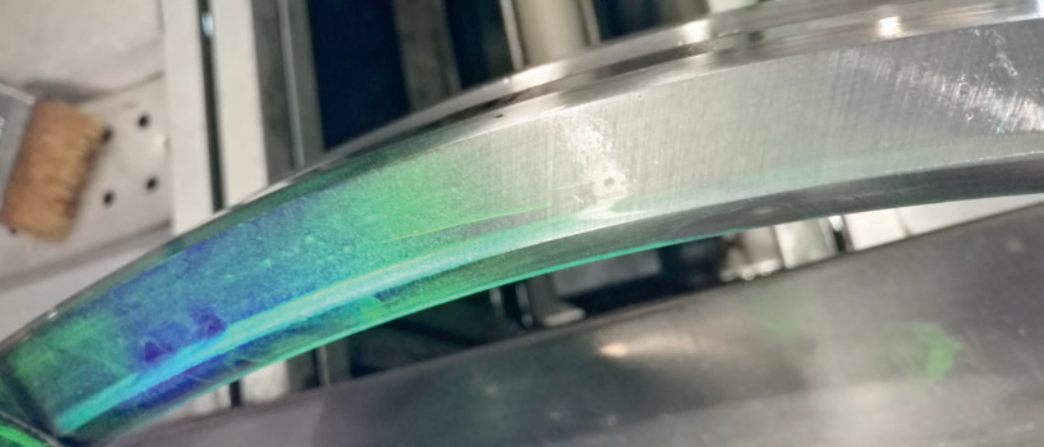 特大型轴承套圈在荧光磁粉检测工序发现裂纹,观察裂纹位于轴承套圈端面,呈线状,大致沿周向分布,长度约3cm,其外观形貌如图1所示。