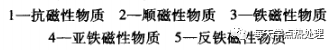 ①抗磁体,磁化率为负(x<0),绝对值很小(10E-6~10E-4),且与外磁场和温度无关,磁化曲线为直线(曲线1)。磁化时,物质的内部产生与外磁场H方向相反的微弱附加磁场H',与外磁场相斥,而使通过的磁力线减少,磁场减弱。非金属硅、磷、硫和金属铜、银、镉、汞等,都是典型的抗磁性物质。②顺磁体,磁化率为正(x>0),数值也很小(10E-5~10E-2),也与外磁场无关,但与温度有强烈的关系,磁化曲线亦为直线(曲线2)。磁化时物质内部产生一与外磁场H方向一致的附加磁场H',与外磁场相吸,使磁场增大。但由于在常温下磁化很困难,磁场不会有明显的增大。稀土金属、碱金属和某些过渡金属(钛、钒、钼等)就是强烈的顺磁性物质。③铁磁体,磁化率很高(x=10~10E6),在弱磁场中即容易被磁化,获得很高的磁化强度,并很快达到磁饱和。磁化强度与外磁场呈非线性关系(曲线3),但随温度的升高而逐渐减小,到居里温度T.时铁磁性消失,转变为顺磁体。金属铁、钴、镍是最典型的铁磁性物质,它们在居里温度T.(相应为770℃、1131℃和358℃)以下,为磁性很强的铁磁体。④亚铁磁体,与铁磁体基本相似(曲线4),但磁化率和饱和磁化强度较低些,是原子磁矩未完全抵消而有净磁矩的磁体。铁氧体(由以Fe2O3为主要成分、与另一种或多种金属氧化物组成的复合氧化物),为目前应用最广泛的亚铁磁性材料。⑤反铁磁体,磁化率非常小(曲线5),一般在10E-5~10E-3之间,是相邻原子自旋磁矩反平行排列的磁体。其磁化率随温度的升高而增大,到奈尔温度T、时达极大值,而后转变为顺磁性。金属铬、α-锰、氧化锰、氧化镍以及过渡金属的离子化合物等,是常见的反铁磁性物质。