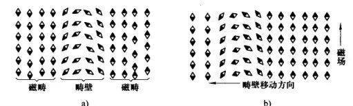 交换能的正负决定于原子间距离和未填满壳层的直径。计算表明,只有在原子间距a和3d层半径r的比值大于3时,交换能才为正值(铁、钴、镍的交换能均为较大的正值)。因此,原子存在未抵消的电子自旋磁矩和电子交换能为正值,是磁畴形成的必要条件和充分条件,它们同时也反映了铁磁材料原子结构的特点。铁磁体在完全退磁状态下,磁畴的磁化方向混乱分布,磁矩完全相互抵消,因而材料在宏观上不显示磁性。当施加外磁场时,那些磁化方向平行于外磁场的磁畴,以由原子磁矩转动所引起的畴壁移动的方式(见图7),吞并反向磁畴而逐渐长大,最后使整个磁畴沿磁场方向排列。在去除外磁场后,如果磁畴的取向不能恢复