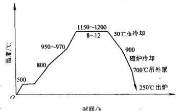 退火温度高,晶粒粗大,于磁性能有利,所以去应力退火一般采用不发生α-γ相变的最高温度,避免冷却时发生相变使晶粒细化。因此,纯铁消除冷加工应力通常采用的再结晶退火工艺制度是:在600℃以下装炉,随炉升温至800℃,再慢速加热到830~890℃,保温4h,然后以不大于50℃/h的冷速冷至700℃,最后随炉冷500℃以下出炉。整个退火在氢气或真空中进行。退火工艺曲线如图13所示。