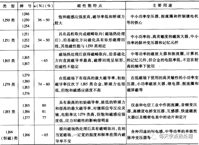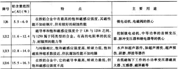 铁镍软磁合金的种类较多,根据其特性和用途可进行表3所示的分类。它们的主要成分和性能见表4。