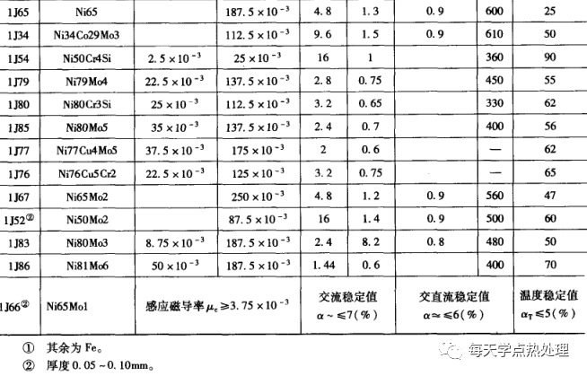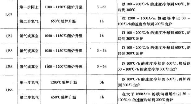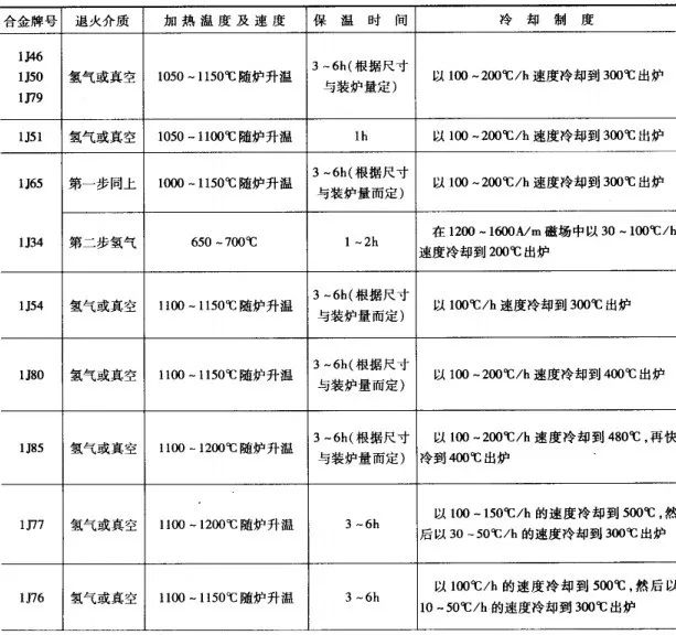 常用高导率、矩磁和恒磁铁镍合金推荐的热处理工艺见表4。