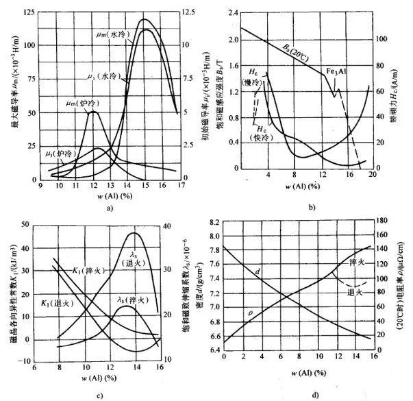 ▲图28 铁铝合金主要磁性能以及有关性能(分图a、b、c、d)随铝含量的变化