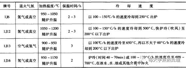 1J6要求具有高的饱和磁感应强度。合金在热处理过程中不发生有序化转变。一般采用比较简单的缓慢冷却方法。出炉温度较低,以降低矫顽力和提高磁导率。为了提高磁性,退火后进行一次磁场热处理。其工艺为:在氢气中重新加热至700-750℃,外加1200~1600A/m的磁场,保温2~4h,然后以50℃/h的速度冷却到250℃出炉。