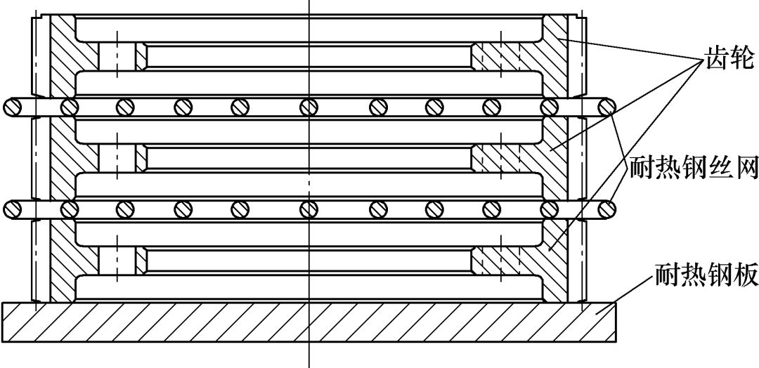 其次,察看现场情况,发现装料方法有问题。主要是装料工装料摆放不合理,齿轮堆放过密。装料方法不合理对热处理畸变有着重要影响。该渗碳摆放方式示意图如图3所示。齿轮平放在蜂窝状的方形耐热钢板上,齿轮摆满一层后上面铺上耐热钢丝网接着再摆放2层齿轮。经过分析,贴近耐热钢板和钢丝网的齿轮端面在渗碳淬火过程中,齿轮的上、下端面升温、降温、淬火时温度不均匀,渗碳气氛扩散循环不畅、渗碳速度快慢不一致,且有渗碳死角,淬火油流动不畅,冷却速度不一致,这是导致齿轮有效硬化层深度和端面部位硬度、心部硬度不均匀的主要因素;再加上高温下渗碳时零件堆放过密,齿轮机加工应力、热应力、组织应力、齿轮自重和工装的重量相互叠加这是诱导齿轮端面蠕变而翘曲变形的另一原因。