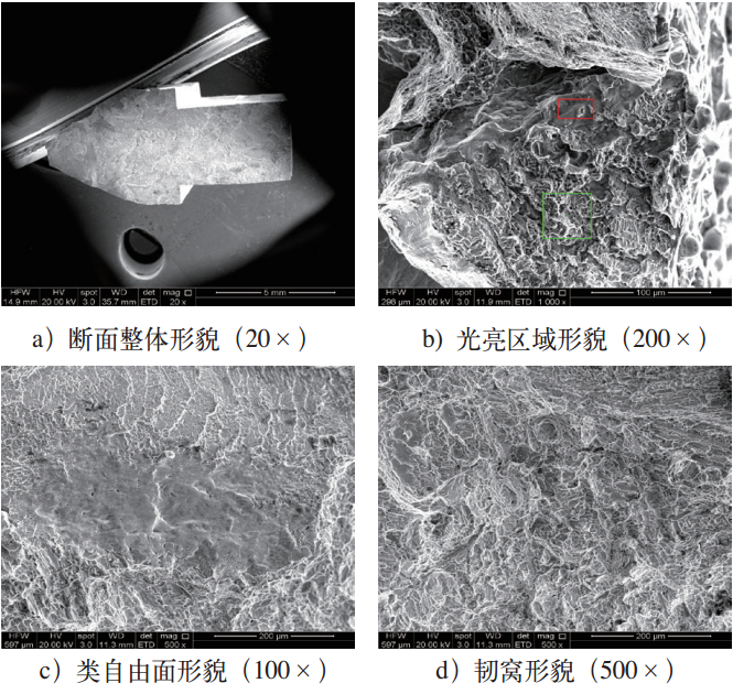 将断口置于扫描电镜下进行观察。断口部分区域存在类似自由面的特征,其他区域均表现为韧窝特征,形貌如图2所示。对类似自由面区域以及韧窝区域分别进行能谱分析,主体元素含量基本一致,均未发现氧元素存在,能谱分析结果见表1。