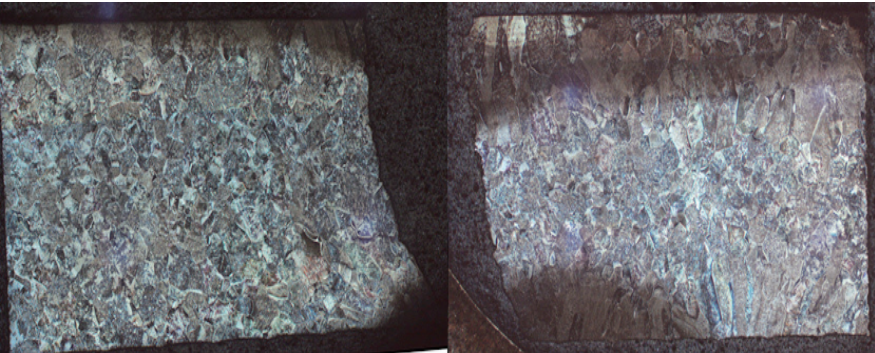 将断口试样从中间对半剖开进行金相分析,如图3所示。观察发现,右侧断口上部存在焊缝区域,下部有柱状晶特征,左右两侧断口上部及下部均存在一定的热影响区,缺陷附近存在明显焊接特征。