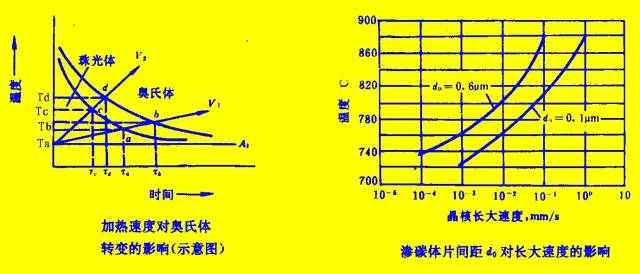 A化温度↑,时间↑(成分均匀,晶粒大,未溶碳化物少,形核率降低)→A稳定性↑,C曲线右移