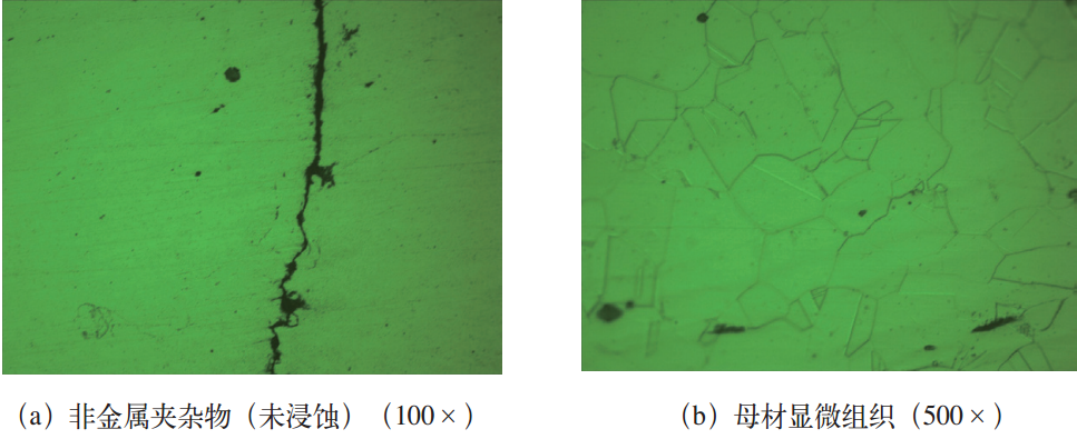 先对试样进行机械抛光,未经浸蚀,在显微镜下观察试样的非金属夹杂物分布情况。通过观察发现,非金属夹杂物较少,但存在单颗粒大尺寸夹杂物,评级为Ds2(见图3a)。非金属夹杂物的存在会破坏基体的连续性,降低其力学性能,从而使基体更容易断裂。非金属夹杂物会使不锈钢基体表面生成的钝化膜(氧化膜)变薄,造成非金属夹杂物与基体结合的部位先受到腐蚀,然后界面处的局部腐蚀会向基体扩展,从而造成点蚀。非金属夹杂物的存在也容易使晶界脆化导致晶间腐蚀,致使耐腐蚀性能下降。