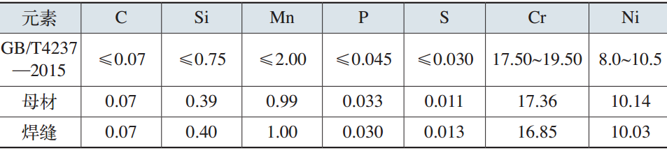 表1 不锈钢管材料的化学成分(质量分数) (%)