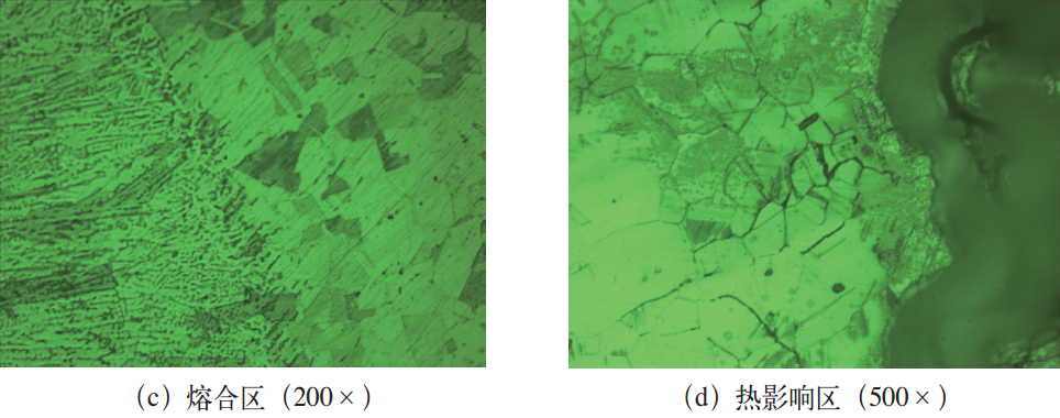 采用ARL-4460直读光谱仪分别对不锈钢管的母材及焊缝的化学成分进行检测,确定化学成分是否符合标准要求。从渗液处(见图1c)截取试样,试样包括母材、焊缝和热影响区,对试样进行预磨、粗磨、精磨和抛光,使用OLYMPUS-GX51金相显微镜对试样进行非金属夹杂物观察,之后用三氯化铁盐酸水溶液对其浸蚀,在金相显微镜下对试样进行组织观察(见图2)。