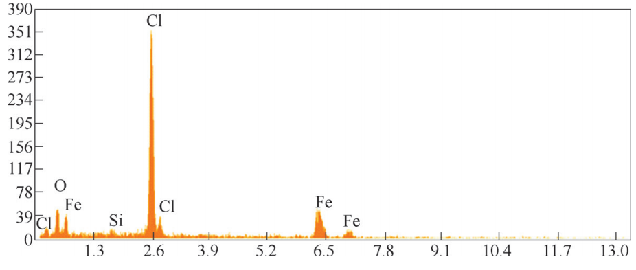 利用能谱仪分析不锈钢管断口表面的腐蚀产物,图5为能谱分析结果。从衍射峰谱图上可以直观地看出,氯含量很高,说明该不锈钢管处于含氯的腐蚀环境中。该化肥厂开裂失效钢管置于露天环境,厂址地处沿海地带,距海岸仅1.1km,属于典型的海洋大气环境。在温度湿度较高时,大量海水蒸发产生盐雾现象,致使空气中含有较高的氯离子,含有氯离子的水分吸附到不锈钢管的外壁,形成腐蚀性介质,对不锈钢管不断腐蚀。奥氏体不锈钢在普通大气环境中,表面会形成致密的钝化膜(氧化膜),此钝化膜隔绝了大气与不锈钢表面直接接触,对不锈钢具有保护作用,使其具有优良的耐腐蚀性能。即使钝化膜被破坏,也会及时再生、修复。而氯离子极容易破坏奥氏体不锈钢的钝化膜,在表面形成点蚀或蚀坑,加速不锈钢的腐蚀。