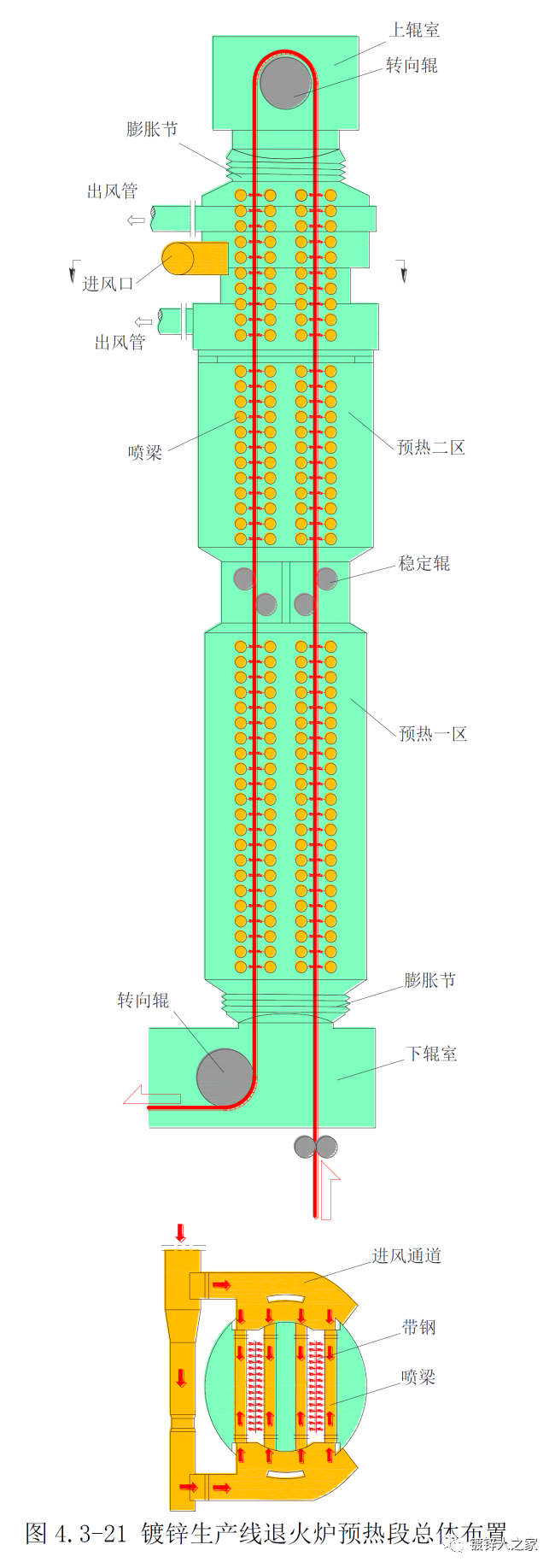 理论和实际经验均表明,如果不对带钢采用喷射废气方式进行对流热交换,只是将带钢置于废气中运行的话,换热效果非常之差。当然,带钢预热的速度也不能太快,否则会影响板形,造成带钢跑偏。因此,预热段一般采用最为简易的方法,即采用管形喷梁上开圆形喷孔的结构,这种结构不但制造简单方便,而且逸流通道畅通无阻,带钢振动较小,使用中也不易变形,寿命较长。一般采用圆筒形炉膛,上下两节,中间设计两对稳定辊,这种炉膛结构紧凑合理,刚度高,不易变形,便于做外保温,炉膛内没有保温材料,可以大幅度提高炉内气体的清洁度,防止气流内的杂质吹到带钢表面。一般镀锌线设计一个圆筒形炉塔,两个行程;连退线设计两个圆筒形炉塔,四个行程。