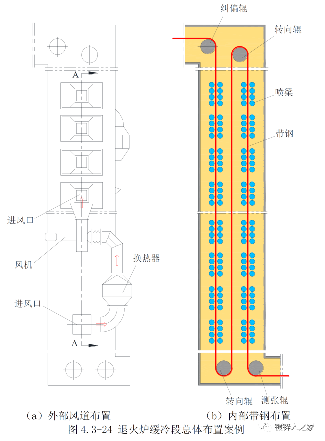 某镀锌生产线退火炉缓冷段总体布置如图4.3-24所示。带钢从上部炉喉进入,从下部炉喉离开,一共有三个行程,但只有前后两个有效冷却行程,中间一个是空行程。设计有上下两台风箱,上风箱从炉塔的下部吸入热气,经过冷却水换热器冷却成冷风后喷向上部的带钢;下风箱从炉塔的上部吸入热气,经过冷却水换热器冷却成冷风后喷向下部的带钢。每台风箱分别设计有四组冷却模块,每个冷却模块有16个喷梁,分别向两个行程的带钢两侧喷射冷却气体。