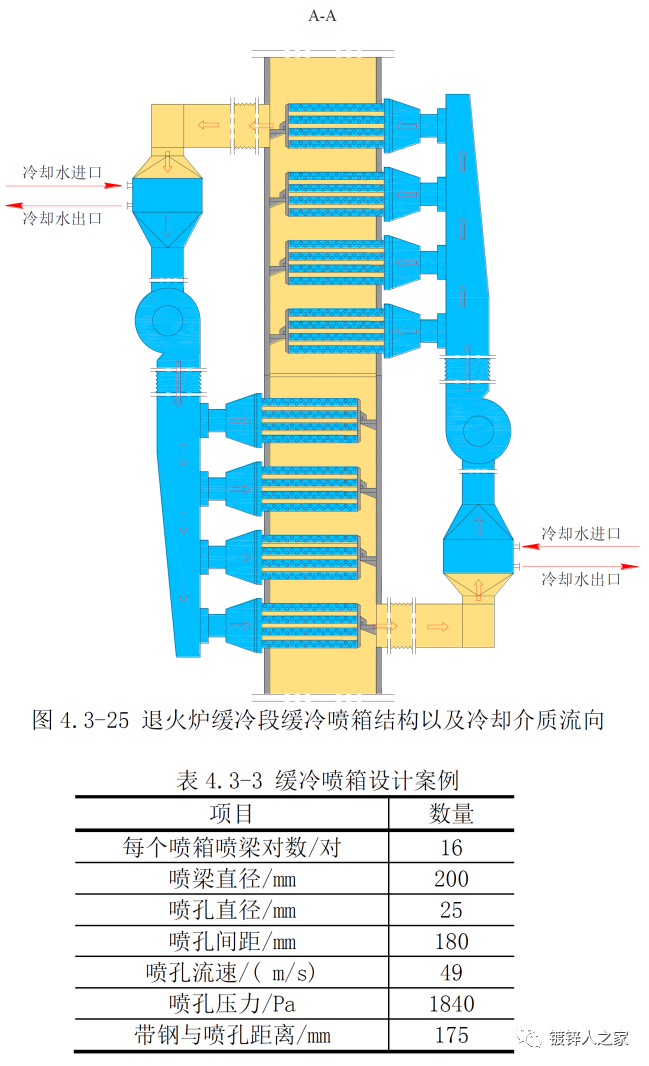 缓冷段根据工艺要求对带钢进行缓慢冷却,因此与带钢的热交换不是很强烈,一般采用普通的立方形炉塔,喷箱采用在管形喷梁上开圆形喷孔的结构。