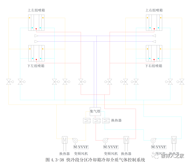 冷却介质气体控制图如4.3-38所示,可以看出,上下两个冷却单元共用一套控制系统,但带钢的中心区域、两个次边缘区域、两个边缘区域所对应的冷却风箱采用单独控制的3台高压变频离心风机,可见该方案是以带钢横向温度均匀性为重点设计的,可以非常精确地进行带钢温度的分区控制。