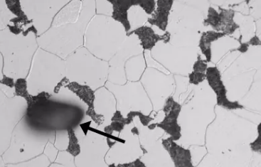 图13 制样过程中残留在20钢试样表面的外来脏物,如箭头所示。它和正常组织不在一个平面,属于比较简单、也好鉴别的制样缺陷。