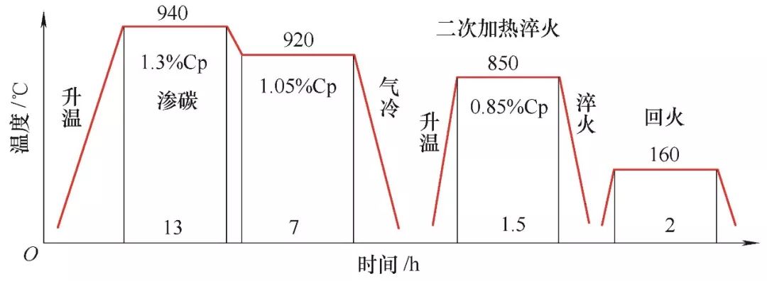 根据以上理论和实践经验,我们认为,常用的渗碳后直接淬火无法获得所期望的碳化物形态,故我们需要先对工件进行渗碳,然后进行低温扩散,使得碳化物在扩散和冷却过程中能沿晶界析出,而后对零件重新加热到淬火温度并进行长时间的保温扩散,使得前面工步中析出的碳化物更加均匀,然后进行淬火硬化和回火。