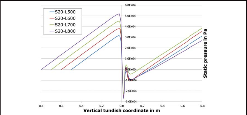 钢水的质量流通量基本上是由中间包中塞棒的位置控制的,数值模型的目的是尽可能好地表这种行为。因此,定义为内部钢水固定质量流量或固定速度分布的边界条件被认为是不够的,因为在这种配置中,钢水流量是固定的,这是一个原则问题,它不依赖于塞棒的位置。使理想行为成为可能的边界条件是钢水入口和出口的压力定义。此外,中间包内的钢水静压随中间包液面高度加大而增加,这意味着中间包底部的钢水静压力取决于中间包的钢水液面的高度。图90显示了在固定的塞棒提升20 mm和不同的中间包钢水液面高度下,中间包内的静压分布,图示表示塞杆提升(S)和中间包钢水液面高度(L),单位为mm,中间包的底部用纵坐标的值0表示,随着中间包钢水液面的增加,中间包底部和塞棒入口处的钢水静压也随之增加。因此,基于该方法,中间包钢水液面高度对钢水质量通量的影响达到了预期效果。
