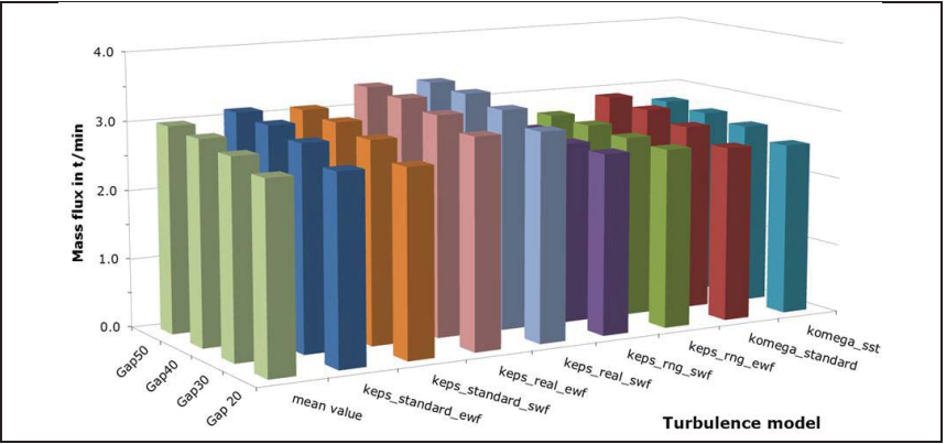 图92显示了研究的湍流模型的钢水流通量,包括所有选择模型的平均值。除湍流模型外,塞棒的抬升高度也不同,即塞棒与水口之间的间隙大小不同。必须注意的是,墙体处理对结果的影响不大。此外,所有类型的湍流模型在钢水流通量方面都显示出相似的结果。基于这些结果选择合适的湍流模型是困难的,甚至无法消除单一的湍流模型。为此,我们进行了文献调查。总结了中间包宏观数值模拟中不同湍流模型的主要特点和优缺点: [18]