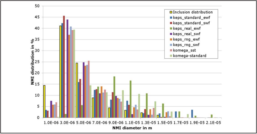 图96显示了不同湍流模型的夹杂物NMI分布。很明显,特别是k-H可实现湍流模型与增强水口型壁处理显示出强烈的差异,特别是在大直径的夹杂物出现的结果。在k-Ω标准模型中可以检测到类似但较弱的趋势,可以说明,对同一湍流模型实施不同的型壁处理会导致夹杂物NMI团聚方面的差异消失。标准型k-H湍流模型和RNG湍流模型的结果具有可比性。