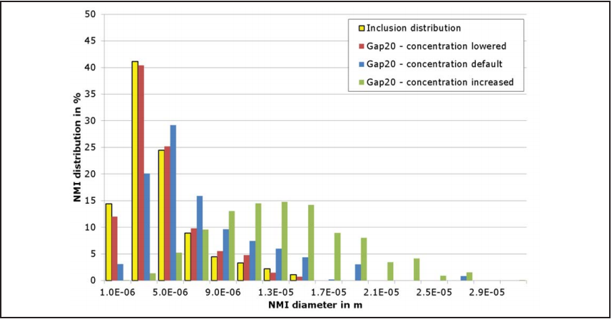 图95显示了非金属夹杂物NMI浓度对粒子团聚的影响,最初的直径分布是黄色的,有一个细的黑色框架包围。低的非金属夹杂物NMI浓度也降低了夹杂物粒子碰撞的概率,即对直径分布的影响很小。图95中的红色条形图表示夹杂物浓度降低,实际上与初始直径分布只有轻微的差别。绿条表示的浓度增加导致了直径分布的显著差异——正如预期的那样,这是由于NMI碰撞的概率大大增加所致。直径为1μm的夹杂物完全消失,其平均值由3 μm转变为13 μm。这与工业生产上得到的试样检验不一致,但表明夹杂物团聚模型是基本正确的。预设夹杂物NMI直径分布结果表明,1 μm的小直径的夹杂物仍然存在,但是明显减小,平均直径现在移到了5 μm。这是一个额外的指标,表明团聚可能的结果取决于初始夹杂物NMI的浓度。