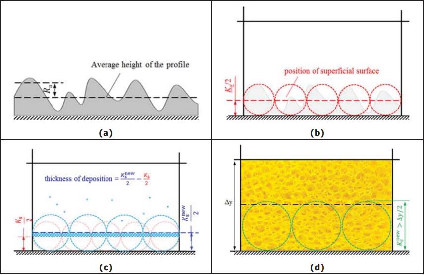 图98 非金属夹杂物颗粒沉积引起的粗糙度变化(UNILEOB-SMMP)(a)任意粗糙度轮廓,(b)等效沙粒粗糙度,(c)粗糙度高度的增加,(d)将单元转化为多孔介质