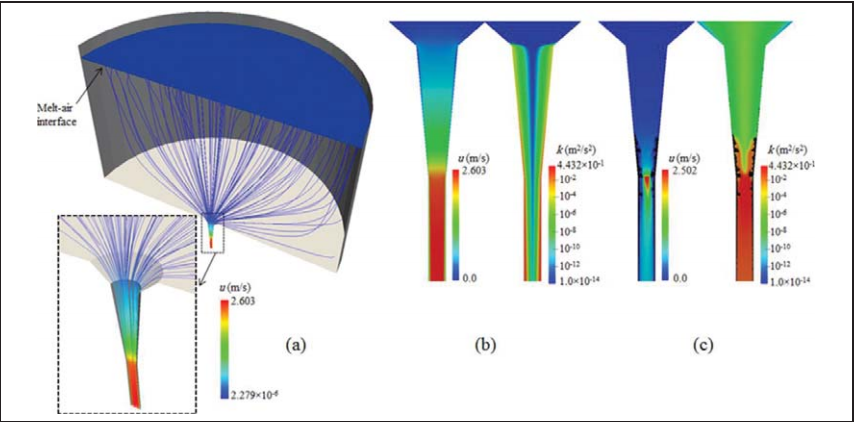 图100 流动特性:(UNILEOB-SMMP), (a)钢水流动流线,(b)速度大小和扰动,清洁水口中钢水的动能,(c)速度大小和湍流,堵塞水口中钢水在200秒后的动能,堵塞用黑色表示
